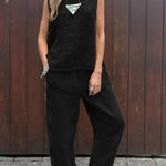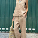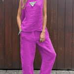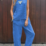 Stylish Monica™ set kombinuje laganu udobnost sa modernim stilom – savršeno za svaki letnji dan. Dizajniran za žene koje cene slobodu, lakoću i ležeran izgled, ovaj set će vas učiniti elegantnom u svakoj prilici, bilo da se opuštate kod kuće, na odmoru ili na putu. Kombinacija bezrukavog topa i prostranih pantalona do članka stvara laskavu siluetu i ultimativnu udobnost.