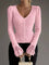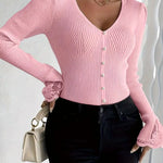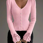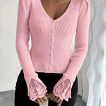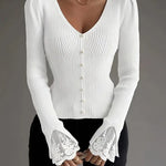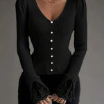 Dodajte dašak elegancije svom garderoberu uz ovu rebrastu, sofisticiranu majicu, dizajniranu da istakne ženstvenost na profinjen način. Dizajn sa V-izrezom, prednje kopčanje dugmadima sa bisernim efektom i rebrasta tekstura naglašavaju siluetu, dok dugi, blago prošireni rukavi sa cvetnim čipkastim detaljem dodaju romantičan i jedinstven akcenat.