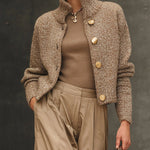 Aurora kaput donosi stil koji obožavaju italijanske žene — elegantan, suptilan i bezvremenski. Prefinjena tkanina i veliki zlatni dugmići stvaraju luksuzan i moderan izgled, uz zadržavanje udobnosti i praktičnosti za svakodnevno nošenje. Kratak, strukturiran kroj naglašava siluetu i stvara harmoničnu, stilizovanu celinu.