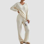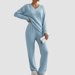 Dizajn: Elegantni top sa V-izrezom i odgovarajuće pantalone